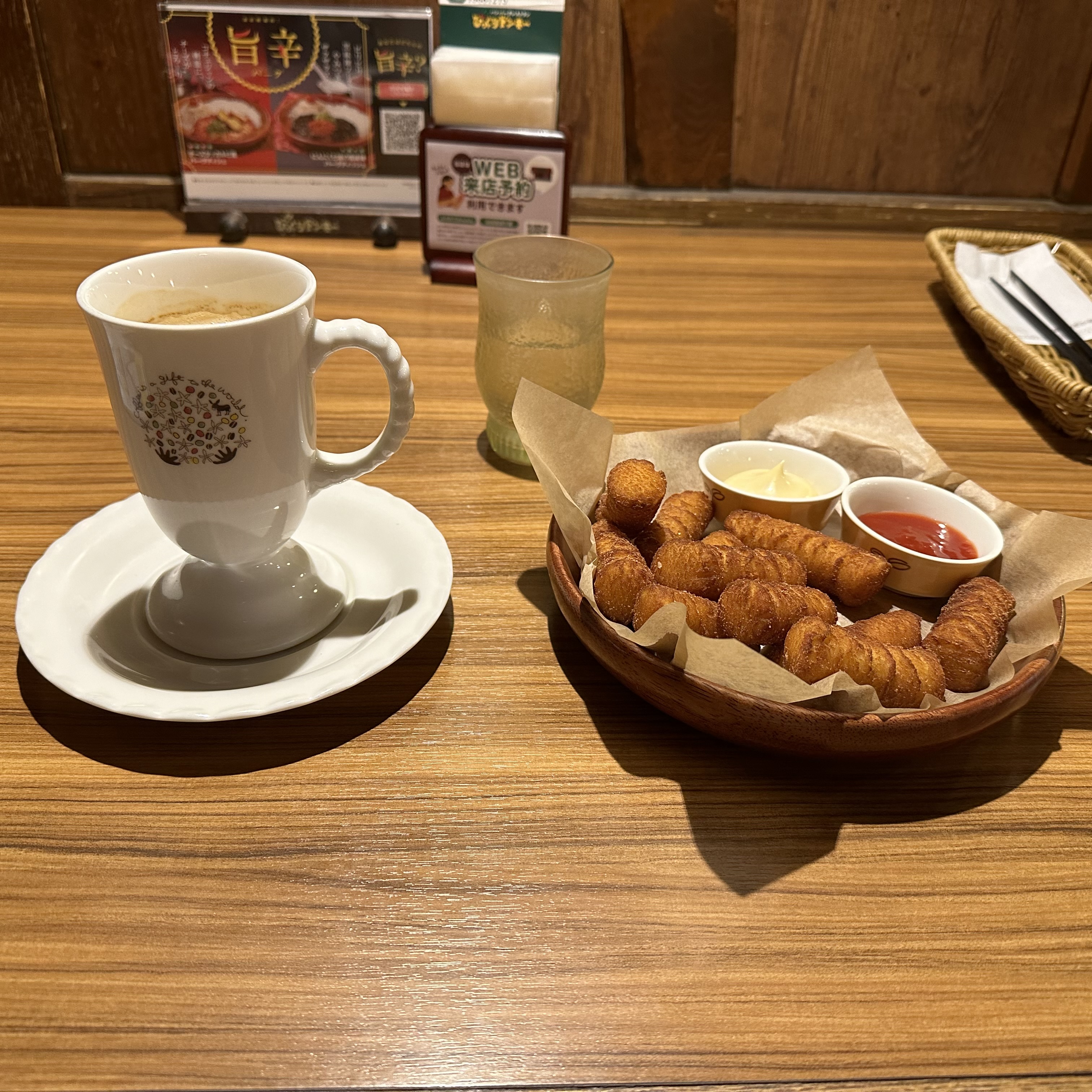 10店くらいコンビニをはしごしてようやく文庫本を発見しました。終電を逃すまでの時間潰しにみていた映画の原作小説が売っていたのでこれを購入しました。これを携え「びっくりドンキー」へ向かいます。この辺りだと24時間営業のファミレスがここしか無さそうでした。ドリンクバーが無いのでポテトとコーヒーを注文。ポテトがめちゃうまでした。
