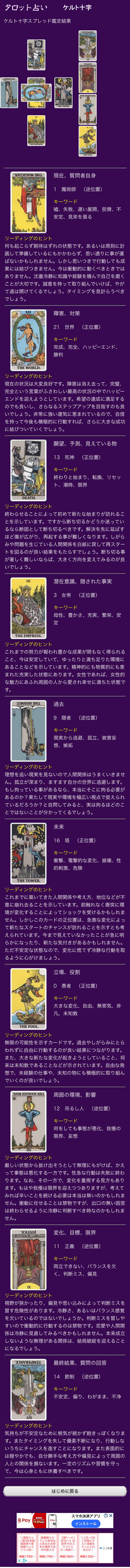 おまけ:初詣に行けそうにもないのでおみくじの代わりにネットでタロットをしました。実は一年目の頃、一時期タロットサークルに所属していました。タロットにハマることなく抜けてしまったのでどう解釈していいものか分からないですが、一応タロット結果だけ載せときますね。