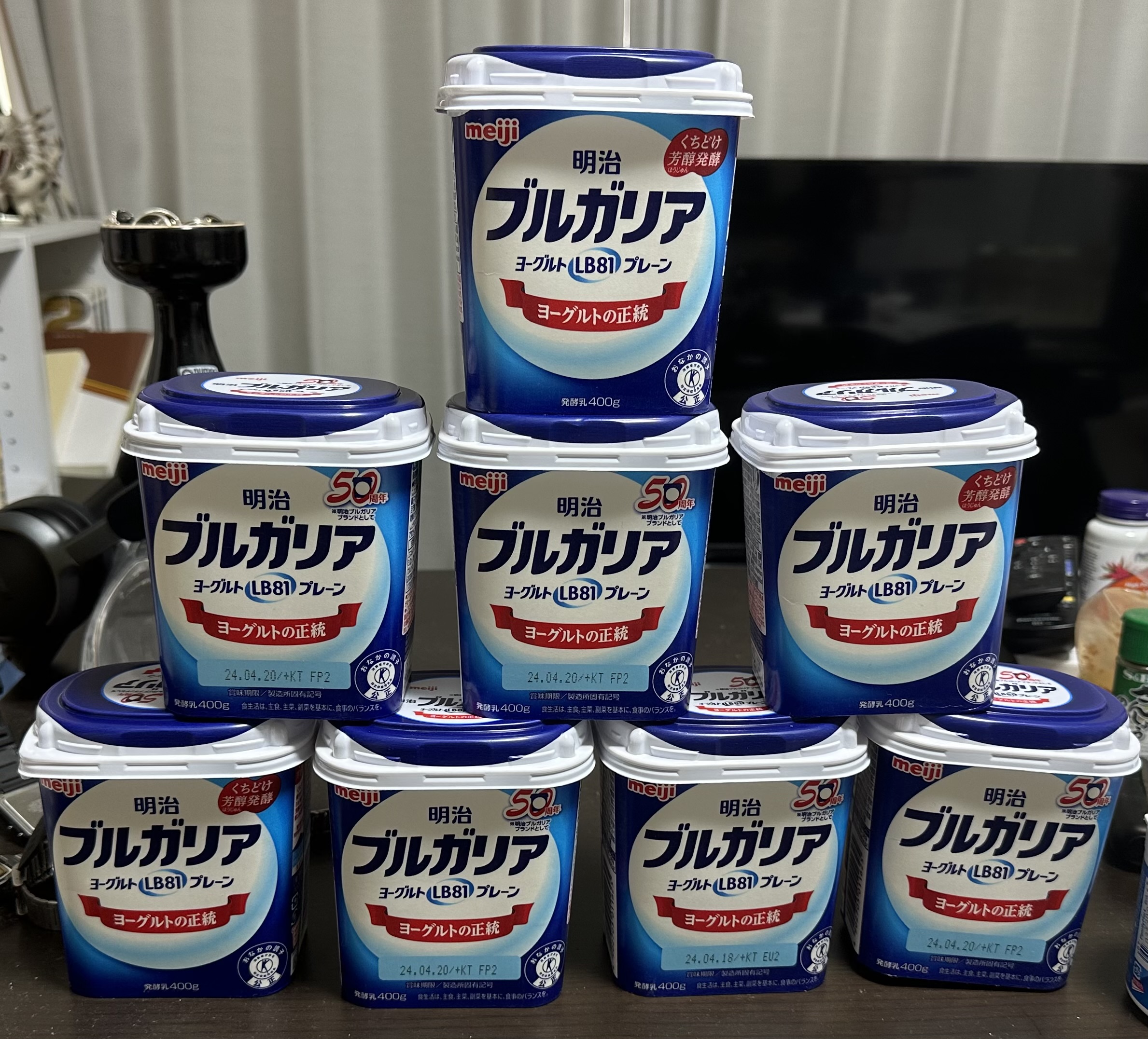 今日はブル極をやっていこうと思います。正式名称は明治ブルガリアヨーグルト極です。 やりたくなったからやりますが、なんせ初めての挑戦なので、どれくらいで苦しくなるか見当もついていません。まーさんのお部屋さんによるとヨーグルト1Lは幸せの範疇らしいです。また、過去にやった似たようなものではフルーチェの2Lがそんなに苦しくなかった思い出なので、とりあえず3Lくらい食べることとします。1パック400gなので8個で3.2kgを食らうことを目標にして頑張ります。 買いに行っている時に気がついたのですが、どうやら今日は近所の小学校の入学式だったみたいです。6歳のガキンチョがスーツを着ている一方で24歳のガキンチョはいつ洗濯したのかも覚えていないズルズルの服を着てアホみたいな量のヨーグルトを携えているの思うところがありすぎて苦しかったです。まあ、こんなことしてるのも今年までです。多分。