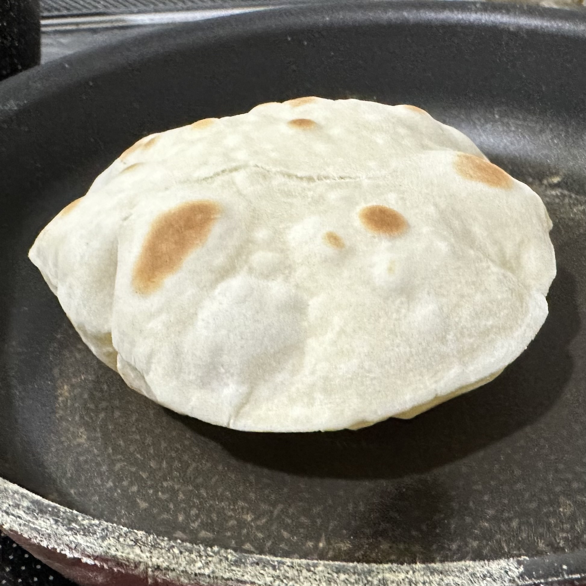 焼くときに、うまいことできるとこんな風にパンパンに膨らんで本場みたいになります。コツがあるので作る際には調べてみてください!